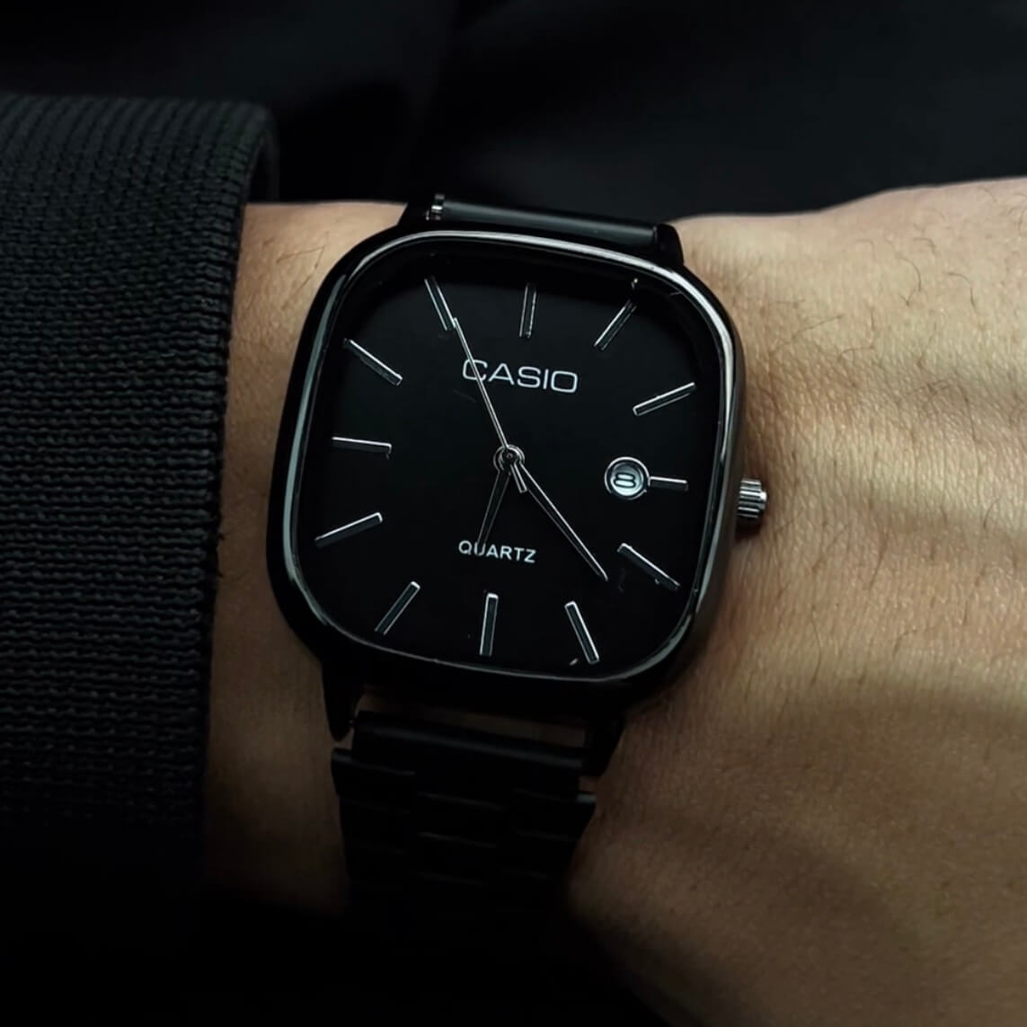 This watch features a modern minimalist design with a sleek, square black dial and a matching black stainless steel link band.